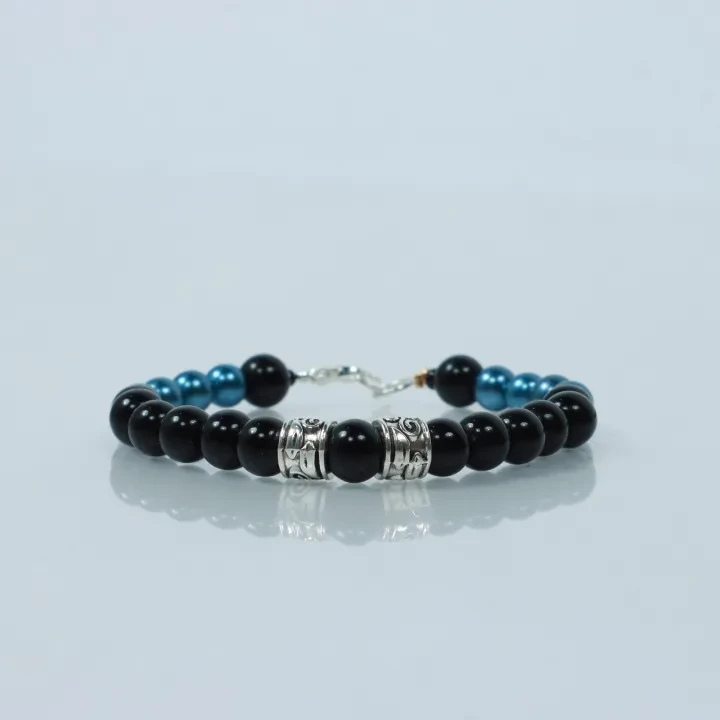 2 Silver Color Stone (Heavy) with Black Beads and Deep Blue Bracelet For Men by
