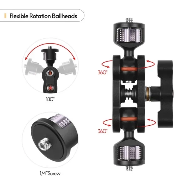 Features: With standard 1/4 inch screws on both ends, compatible with most camera cage, monitor, LED video light, etc. Designed for mounting monitor, LED light or other devices to camera cage or other bracket with 1/4 inch screw hole. With dual rotatable ball heads, you can adjust the usage angle freely; and the side locking knob ensures easy and quick tightening. There are dual screw holes(1/4 inch or 3/8 inch) on the locking knob for more powerful accessories extension. Made of high-quality aluminum alloy, and after CNC machining and surface heat treatment, the bracket is durable and rust-resistant.