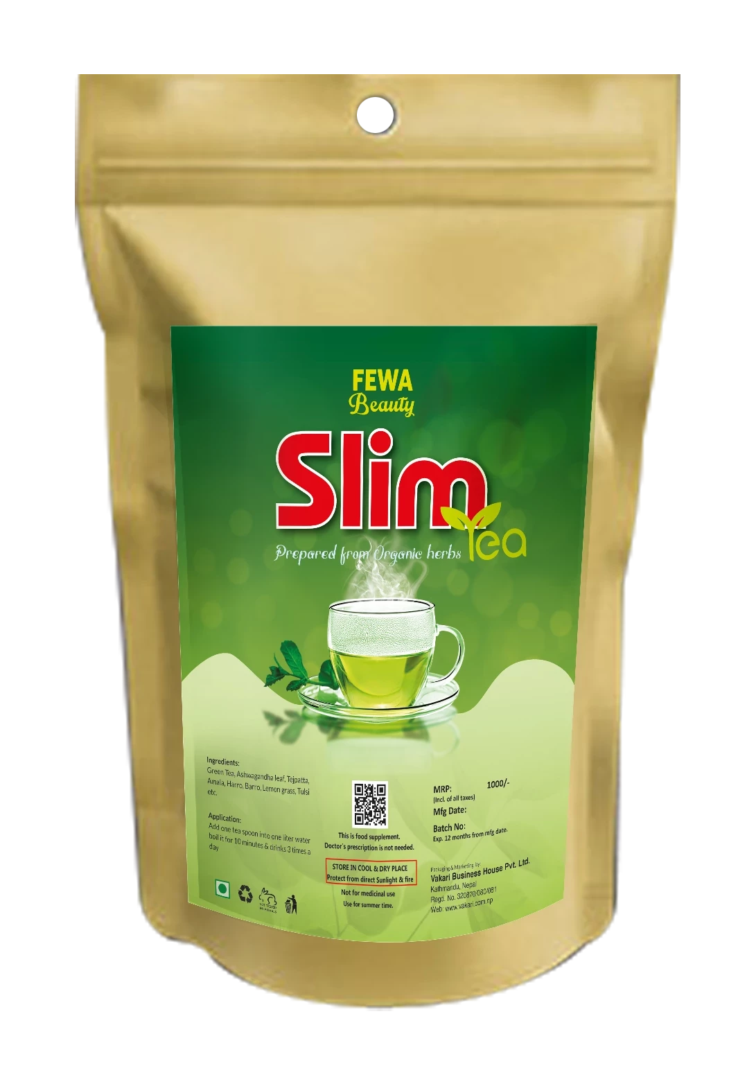 Preparation: Add one teaspoon of Fewa Beauty slim Tea into one liter of water.